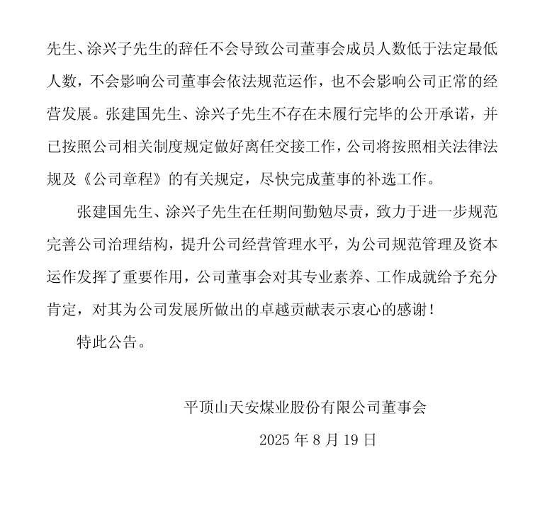 8月19日,平煤股份發布公告稱,公司董事會近日收到公司董事張建國先生、涂興子先生的書面辭職申請。張建國先生因工作調整原因、涂興子先生因退休原因,向公司董事會申請辭去公司第九屆董事會董事及戰略委員會委員職務。根據《公司法》《公司章程》的有關規定,張建國先生、涂興子先生的辭職申請自送達公司董事會之日生效。張建國先生、涂興子先生辭職后,不再擔任公司其他職務。