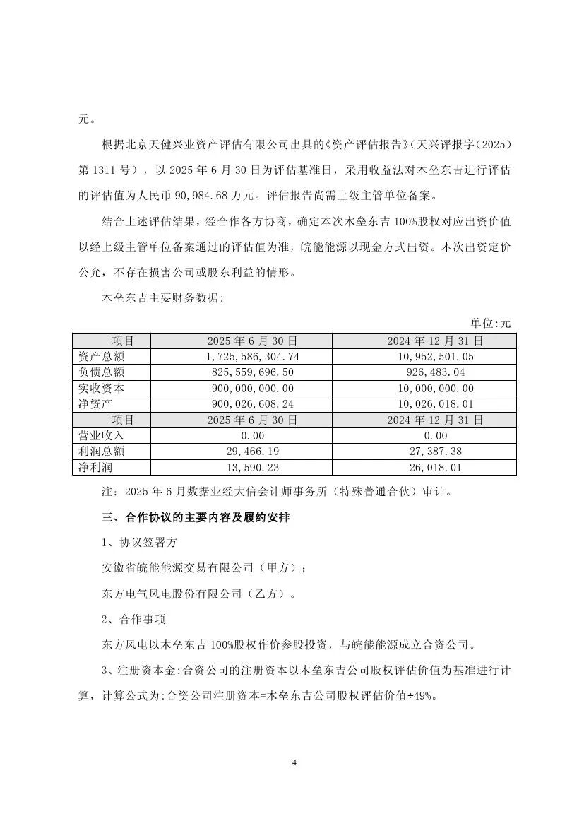 東方電氣控股子公司與皖能能源共同成立合資公司,東方風(fēng)電持股49%,皖能能源持股51%。合資公司注冊資本為:185,683.0205萬元,東方風(fēng)電以木壘東吉新能源有限公司100%股權(quán)作價出資,根據(jù)北京天健興業(yè)資產(chǎn)評估有限公司出具的資產(chǎn)評估報告,基于評估基準(zhǔn)日2025年6月30日,木壘東吉新能源有限公司評估后的股東全部權(quán)益價值為90,984.68萬元,皖能能源以94,698.3405 萬元現(xiàn)金出資。