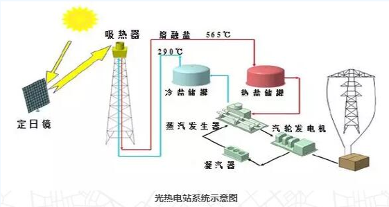 光熱電站位于光伏電站南側(cè),采用塔式熔鹽技術(shù),儲熱時長為12小時。
