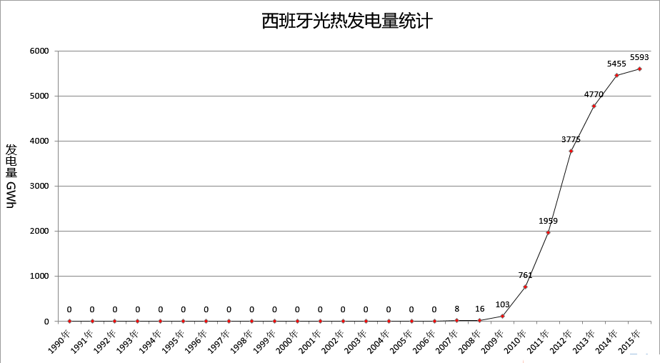 圖表:西班牙光熱發電量統計(1990~2015年)