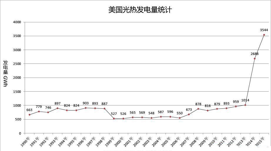 圖表:全球光熱發電量統計(1990~2015年)